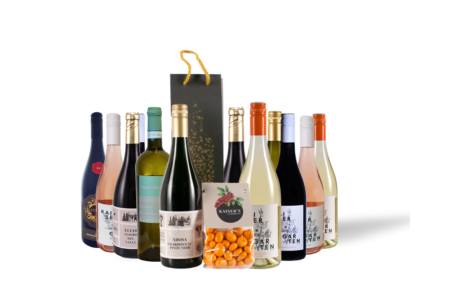 A Filius egy könnyű fiatal bor, finoman fűszeres illattal és gyümölcsös könnyedséggel. A Kaiser Rosé száraz, nyári élvezet friss lédússággal és világos rózsaszín színnel. A Kaiser Amaranto Rouge kivételes eleganciájával, bogyós gyümölcsös ízével és egyedi jellegzetességeivel nyűgöz le. Az argentin Mendozából származó Elias Malbec egy többrétegű vörösbor fekete cseresznye, szeder és egy csipetnyi csokoládé jegyeivel. A Xhosa Pinot Noir/Chardonnay Rosé a fehér- és vörösborok egyedülálló kombinációjaként lep meg citrusfélék, őszibarack, málna és eper ízével. Casale Tre Colori D.O.C. Friss és fiatalos, virágos jegyekkel, őszibarack és sós alma ízekkel. A készletet a Kaiser áfonya narancsos csokoládéval és egy exkluzív Promo Royal ajándéktáskával egészítjük ki.