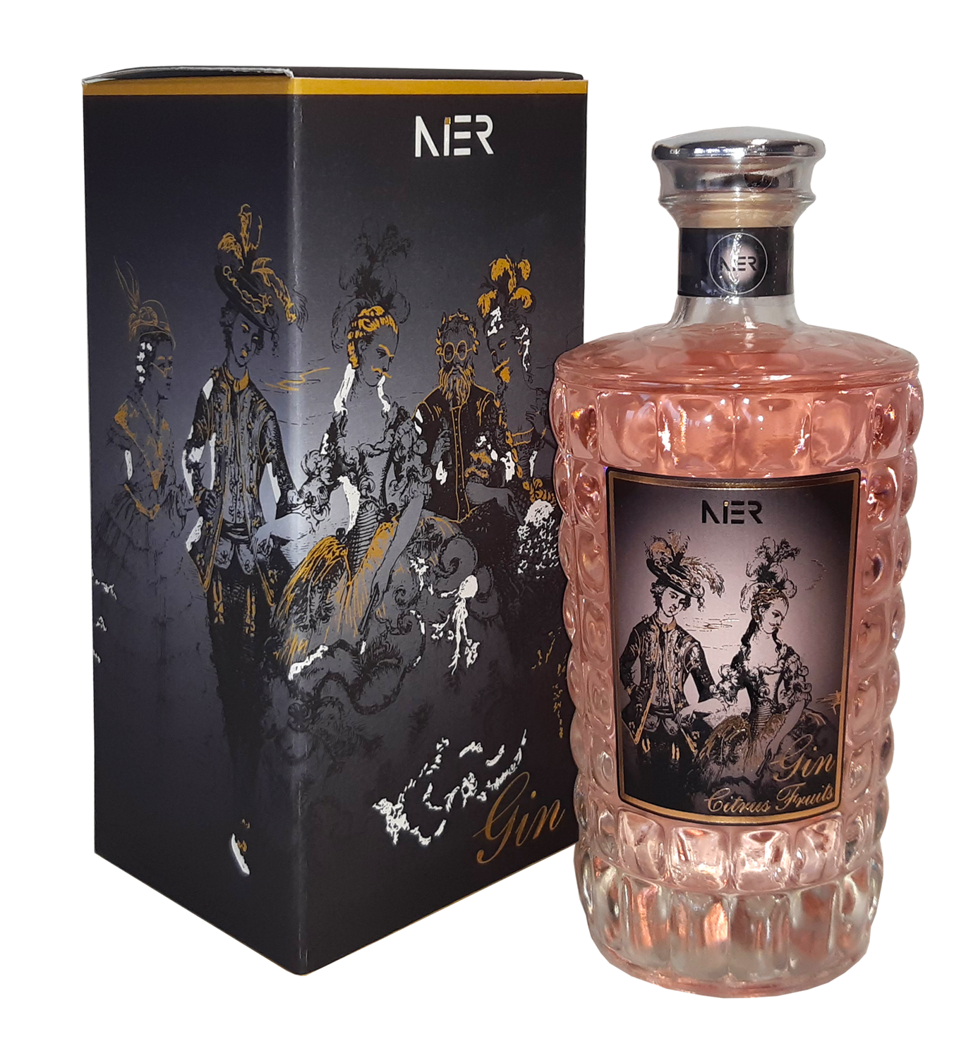 Az alapja egy semleges fehér törkölypálinka + boróka + citrusfélék = Nier Gin, a színt az arónia ( fekete berkenye ) és a gránátalma adja. Mindez egy gyönyörű kristály palackban.