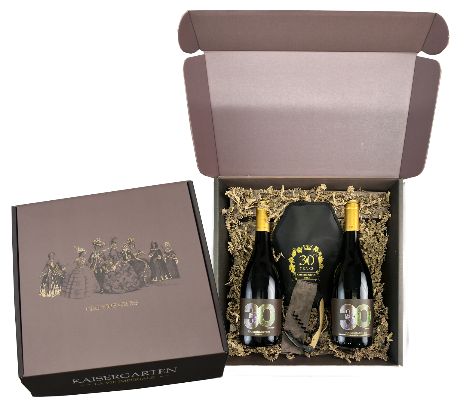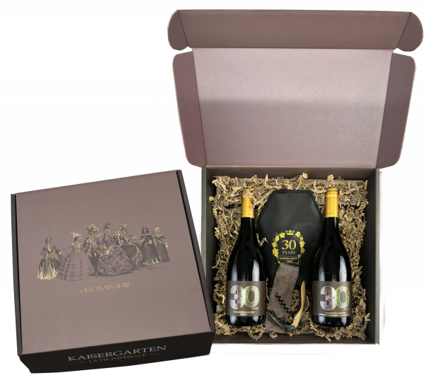 Magyarországról induló utazás történelmünkön keresztül– ezt idézi a karakteres Balatoni Syrah. Mai ausztriai központunkat pedig a kifinomult Burgenlandi Pinot Blanc/Chardonnay szimbolizálja. Ez a különleges borszett limitált díszdobozban érkezik, amely az exkluzív tételek mellett egy prémium dugóhúzót és az egyedülálló Sleeve borkiöntő-hűtőt is tartalmazza. Tisztelgés 30 év szenvedélye és hagyománya előtt – tökéletes választás igazán különleges pillanatokhoz.