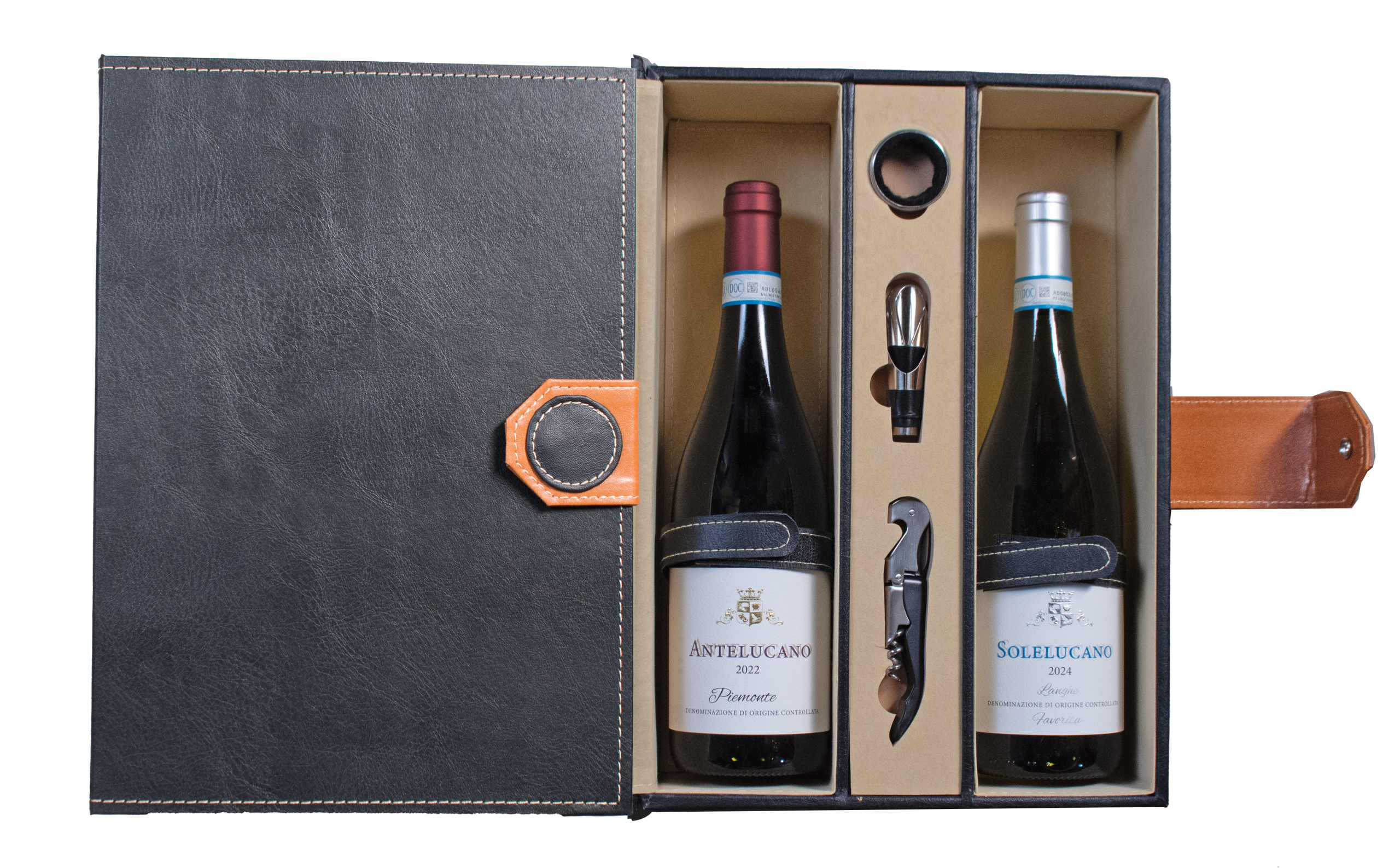 Ajándék az olasz borkultúra igazi ismerőinek A friss és elegáns Solelucano Langhe Favorita finom gyümölcsösségével és üde könnyedségével hódít, míg a karakteres Antelucano Piemonte Selezione Speciale mélységével és kifinomult szerkezetével nyűgöz le. Együtt olyan harmonikus párost alkotnak, amely tökéletesen ötvözi a változatosságot és az eleganciát. Az élményt az exkluzív, fekete bőr díszdoboz barna részletekkel és csattal teszi teljessé, melyhez praktikus kiegészítők – dugóhúzó, cseppgyűrű és kiöntő – is társulnak. Egy ajándékcsomag, amely stílust és ízlést sugároz, és minden részletében az olasz életérzés esszenciáját hordozza.