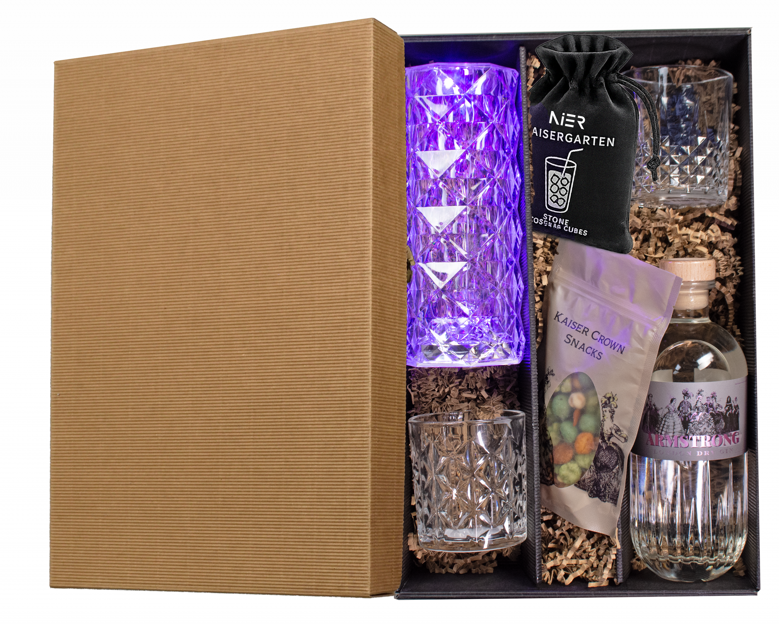 Egy ajándék, amely stílust és kifinomultságot sugároz: az aromás Armstrong Berries gin lágy bogyós jegyei két elegáns kristálypohárban bontakoznak ki igazán. A különleges hangulatról a modern LED-asztali lámpa gondoskodik, míg a kőhatású jégkockák a hűsítő élményt teszik teljessé. Az élményt egy ínycsiklandó, pikánsan fűszeres Deli Wasabi snack egészíti ki. Mindez egy fekete-barna, exkluzív díszdobozban kap helyet – egy szett, amelyben az élvezet, a design és az elegancia tökéletes harmóniában találkozik.
