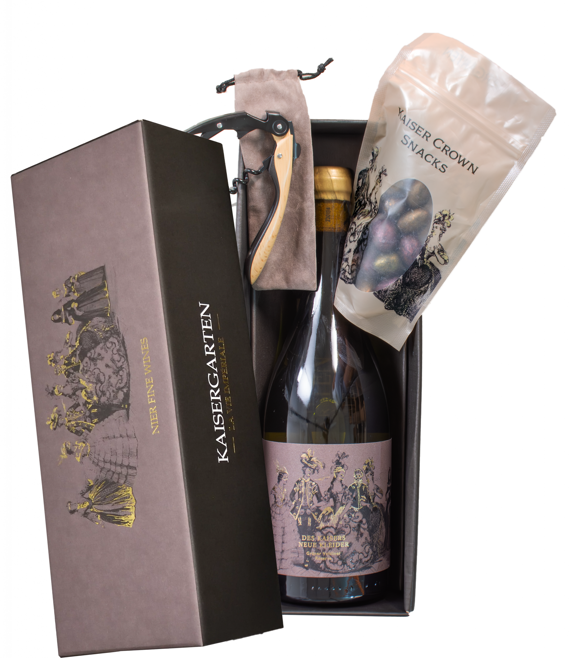 Egy exkluzív ajándék, amely a szabadság élményét nyújtja: az exkluzív Kaisergarten díszcsomagolásban, a DKNK prémium vonalhoz igazítva. Döntse el Ön, melyik bort szeretné ajándékba adni. ( A palack bort a készlet ára nem tartalmazza. ) Az összeállítást elegáns nugátmandula teszi igazán kifinomulttá, míg a stílusos designer dugóhúzó gondoskodik a palack elegáns és kíméletes nyitásáról. Egy ajándék, amely az eleganciát, az egyediséget és a gasztronómiai élményt harmonikusan ötvözi.