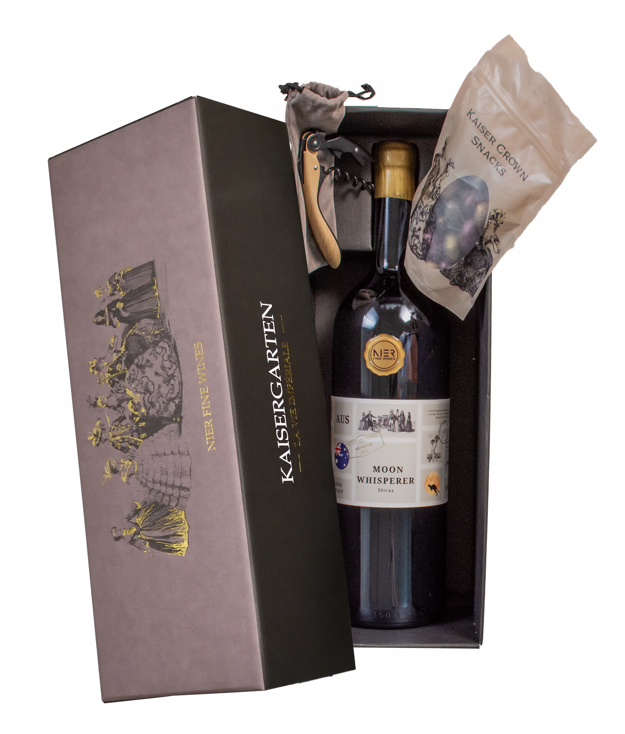 Impozáns méret és páratlan elegancia. A lenyűgöző Magnum Kaiserbox méltóságteljesen rejti magában a karakteres Moon Whisperer Shiraz-t a Barossa-völgyből – erőteljes, mély és lenyűgöző intenzitással. Tökéletes kísérői a prémium rézszínű nugátmandulák, melyek édes kifinomultsággal gazdagítják az élményt. Az élvezetet az exkluzív kiadású dugóhúzó teszi teljessé, amely stílusosan koronázza meg a pillanatot. Ez az ajándékcsomag nem csupán a borkedvelőket varázsolja el, hanem valódi exkluzív ajándék, amely maradandó benyomást kelt.