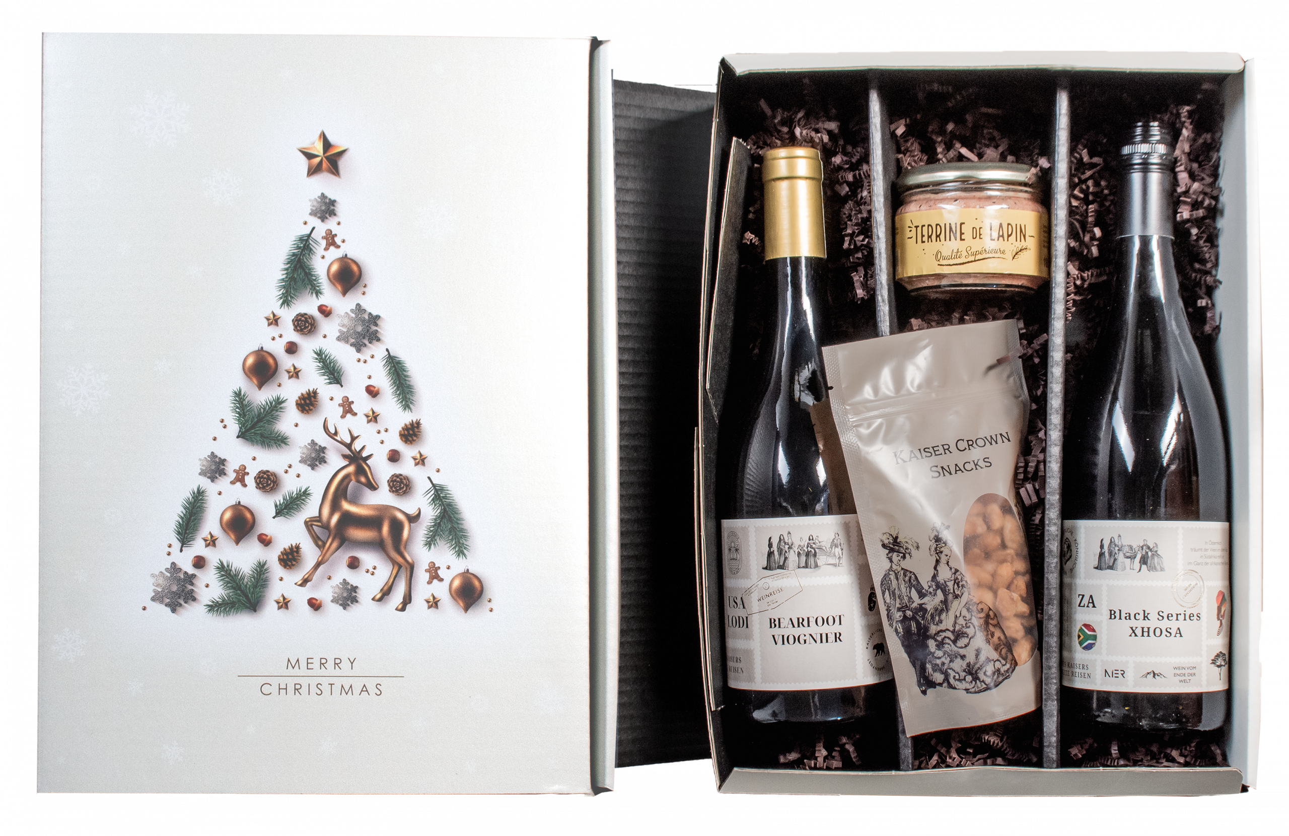 Rudolph – a Mikulás kedvenc rénszarvasa ihlette ajándékcsomag Ez az exkluzív válogatás azoknak készült, akik értékelik a markáns, mégis elegáns borokat. A Xhosa Black Series Shiraz/Merlot fűszeres karakterével és mélységével hódít, míg a Bearfoot Viognier üde gyümölcsösséggel és kifinomult eleganciával tölti meg a poharat. A borok mellé különleges ínyencségek társulnak: aromás vajkaramellás-diós keverék, valamint egy finom nyúlterrine, amelyek édes és sós élményeket egyesítenek – a tökéletes harmóniáért. Egy ajándékcsomag, amely méltó ünnepi pillanatokat varázsol.
