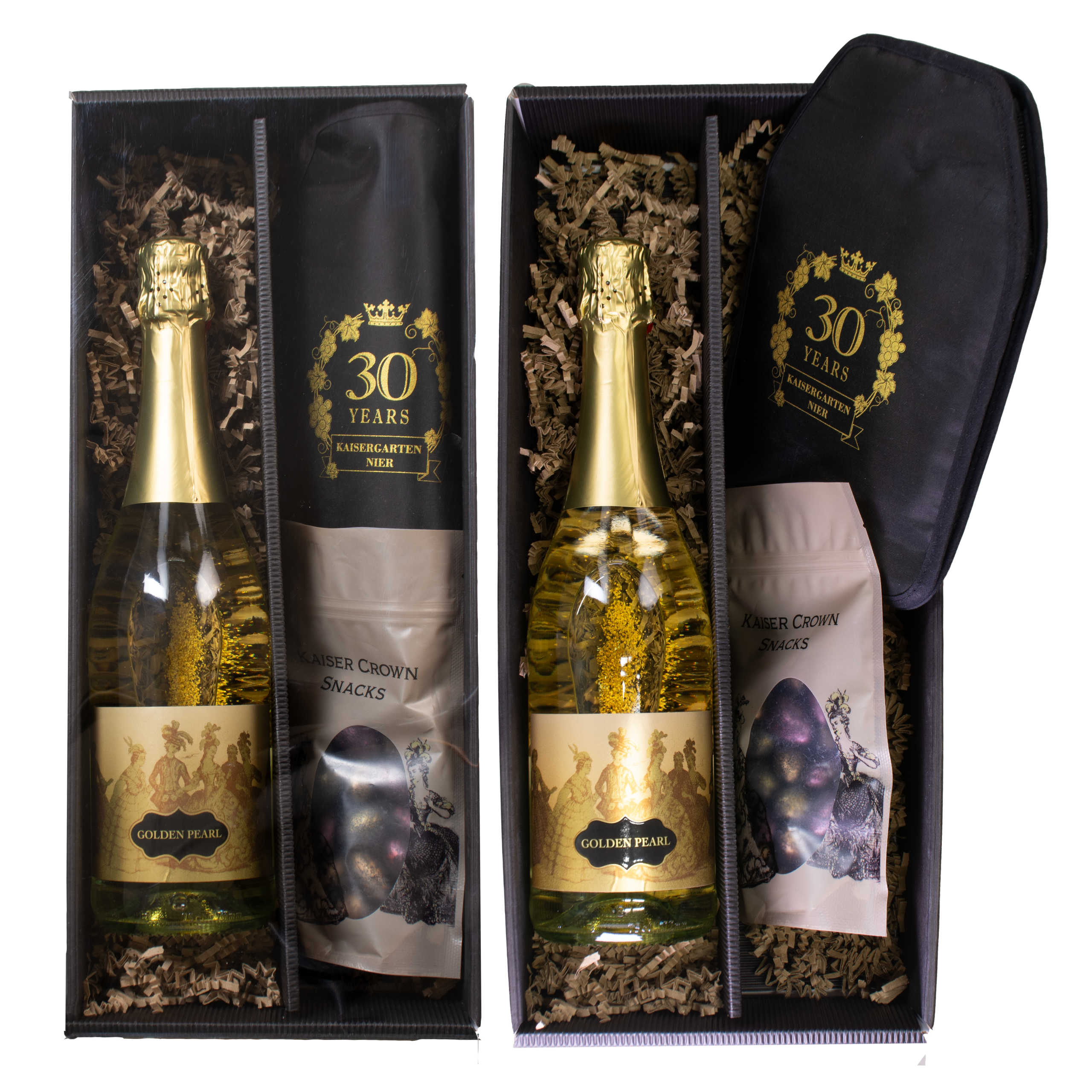 Egy csipetnyi luxus a különleges pillanatokhoz A Golden Pearl valódi 22 karátos arany lemezkékkel ragyog a pohárban, és minden alkalmat egyedivé varázsol. Tökéletes kísérője a csillogó mandula, amely elegáns roppanással teszi teljessé az élményt. A szett része a jégzselés Sleeve Cooler is, amely gondoskodik arról, hogy a pezsgő ital mindig tökéletes hőmérsékleten maradjon. Egy ajándék, amely a ragyogást és az élvezetet elegáns módon ötvözi.